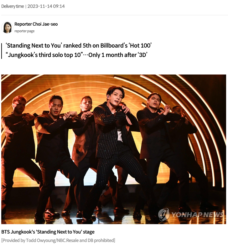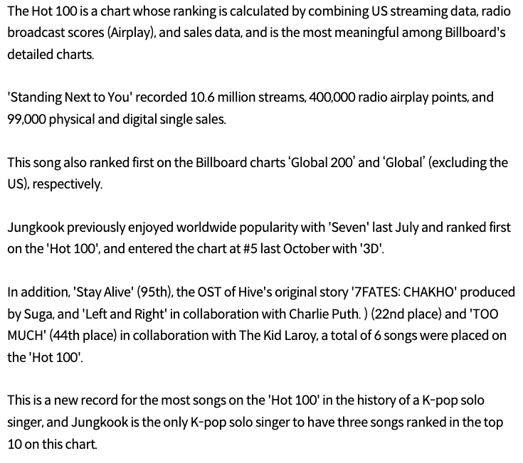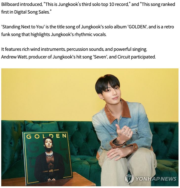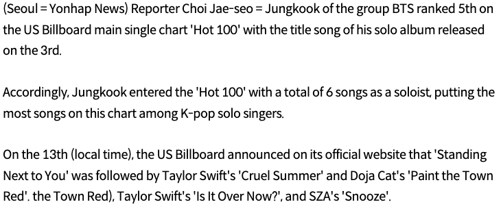 BTS's Jungkook has achieved a remarkable feat by entering the US Billboard main single chart 'Hot 100' at the 5th position with the title song from his solo album released on the 3rd.