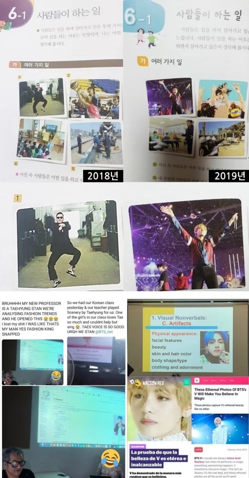 V continues to be utilized in educational materials both domestically and internationally. In South Korea, he was featured in the revised edition of the Gyeonggi Provincial Office of Education's 2019 Citizenship Education textbook for 5th and 6th graders, under the theme "People's Occupations," representing the occupation of a singer in the first photo illustrating the explanation.