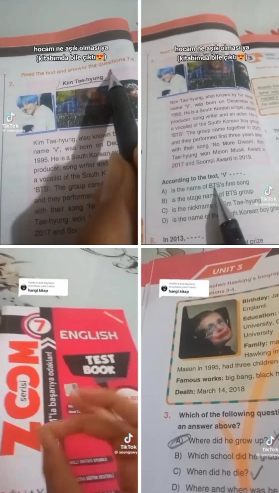The appearance of V from BTS in a Turkish middle school second-year (7th grade) English textbook has garnered attention. The textbook includes questions about V's real name, birthdate, occupation, the formation of the BTS group, debut details, debut song, and awards history, providing a comprehensive overview of V's journey.